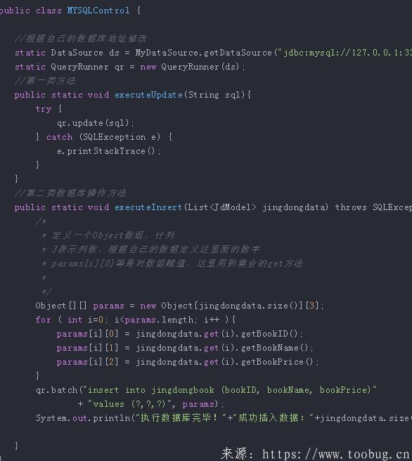 下面是MYSQLControl,主要使用QueryRunner方法操作数据库,使用时是batch方法。