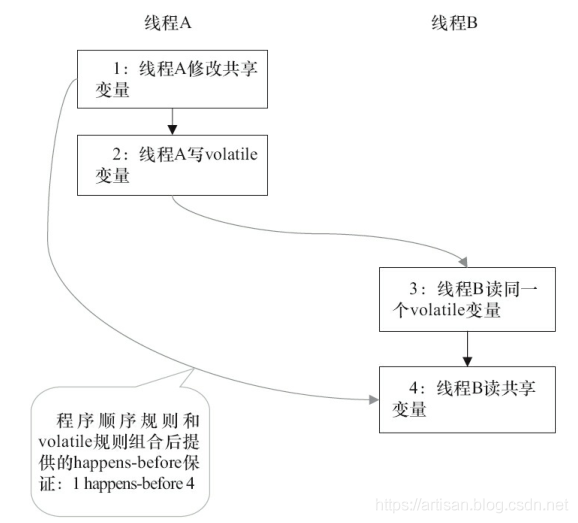 2 happens-before 3是由volatile规则产生。前面提到过,对一个volatile变量的读,总是能看到(任意线程)之前对这个volatile变量最后的写入。因此,volatile的这个特性可以保证实现volatile规则。