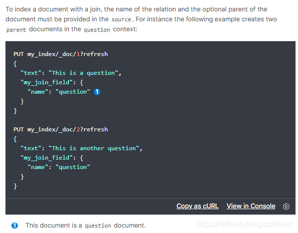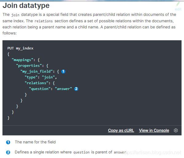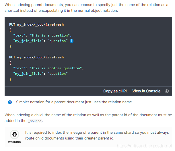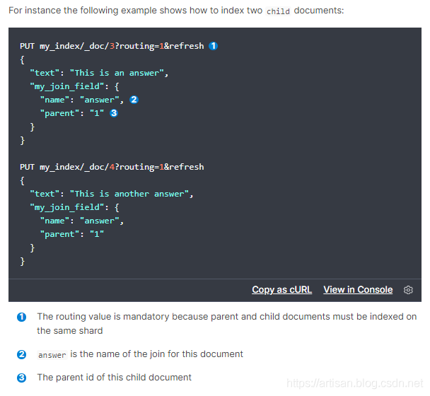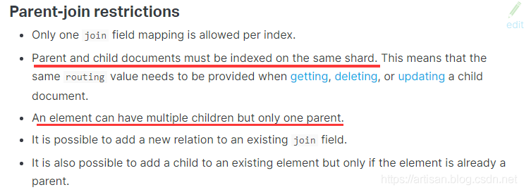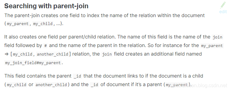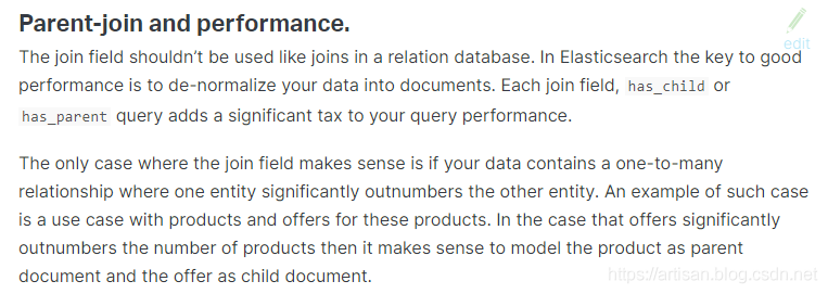 一对多关系的建模,维护起来比较方便,而且我们之前说过,类似关系型数据库的建模方式,应用层join的方式,会导致性能比较差,因为做多次搜索。父子关系的数据模型如下每个join field 的 has_child或has_parent查询都会对查询性能产生重大影响:
