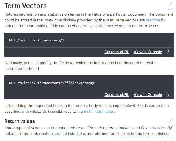 概括来说:Term Vectors就是 获取document中的某个field内的各个term的统计信息