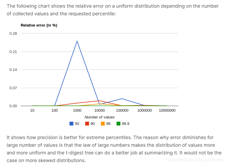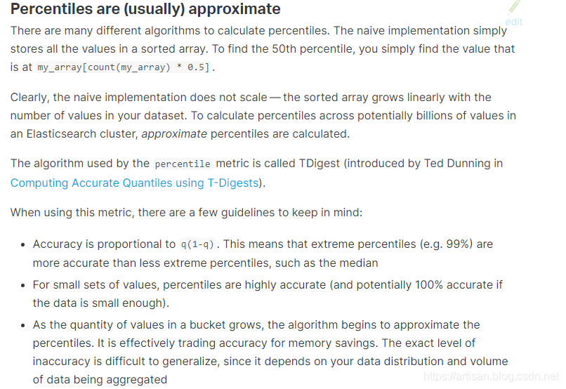 TDigest算法,用很多节点来执行百分比的计算,近似估计,有误差,节点越多,越精准