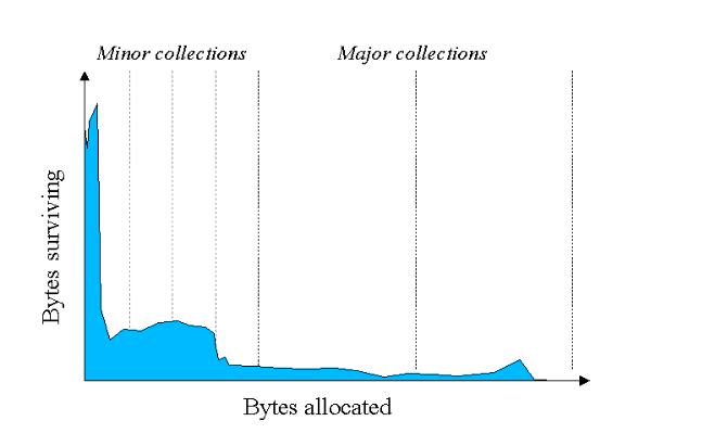 之前说过,逐一标记和压缩 Java 虚拟机里的所有对象非常低效:分配的对象越多,垃圾回收需时就越久。不过,根据统计,大部分的对象,其实用没多久就不用了。