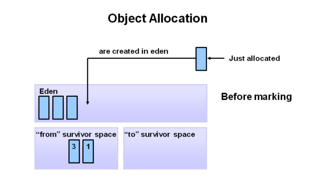 首先,所有的新对象分配给 eden 空间,两个 survivor 空间都是空的。