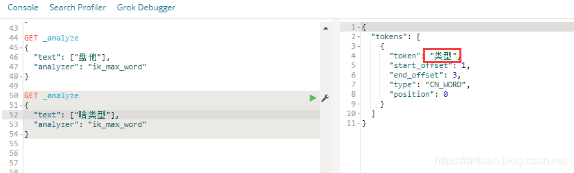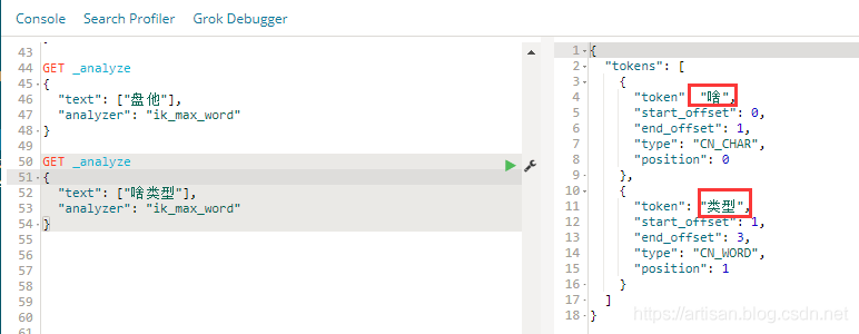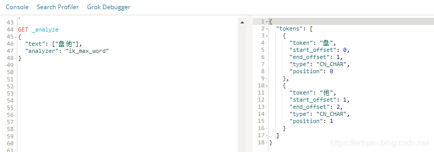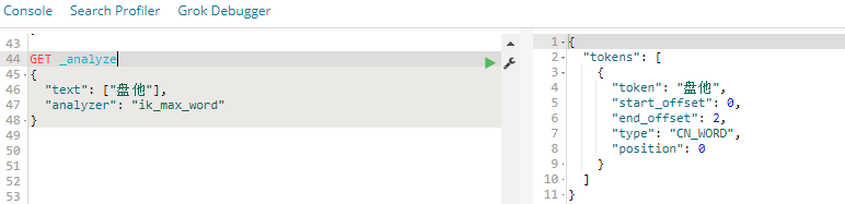 使用 ik_max_word 来看下 IK的 对 “盘他”的分词