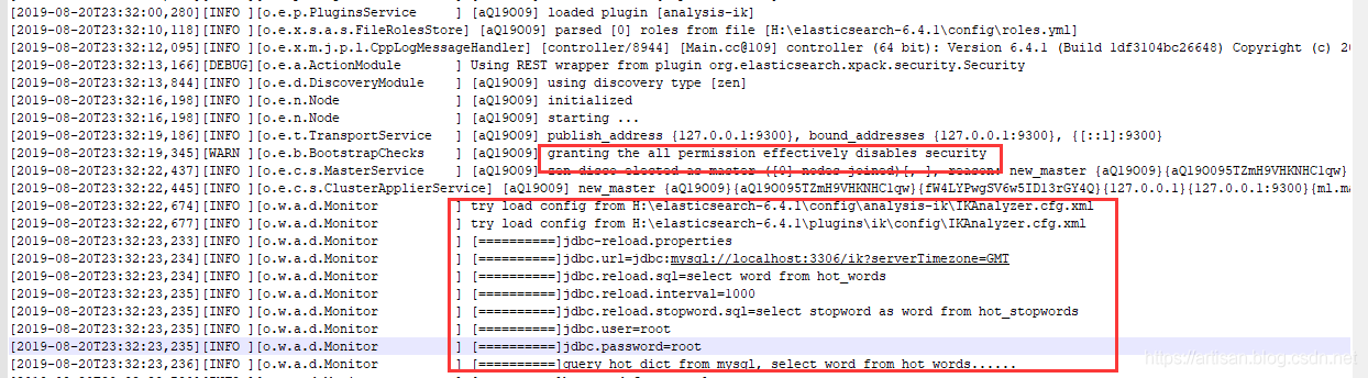[2019-08-20T22:32:49,435][INFO ][o.e.c.s.MasterService ] [aQ19O09] zen-disco-elected-as-master ([0] nodes joined)[, ], reason: new_master {aQ19O09}{aQ19O095TZmH9VHKNHC1qw}{PjHRPar4TV2JQ-iy-bWIoA}{127.0.0.1}{127.0.0.1:9300}{ml.machine_memory=10614976512, xpack.installed=true, ml.max_open_jobs=20, ml.enabled=true}