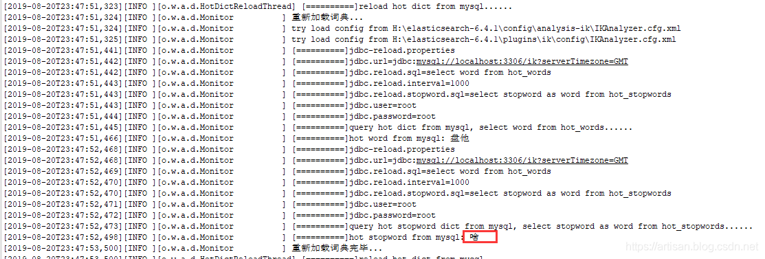 logger.info("[==========]query hot dict from mysql, " + prop.getProperty("jdbc.reload.sql") + "......");