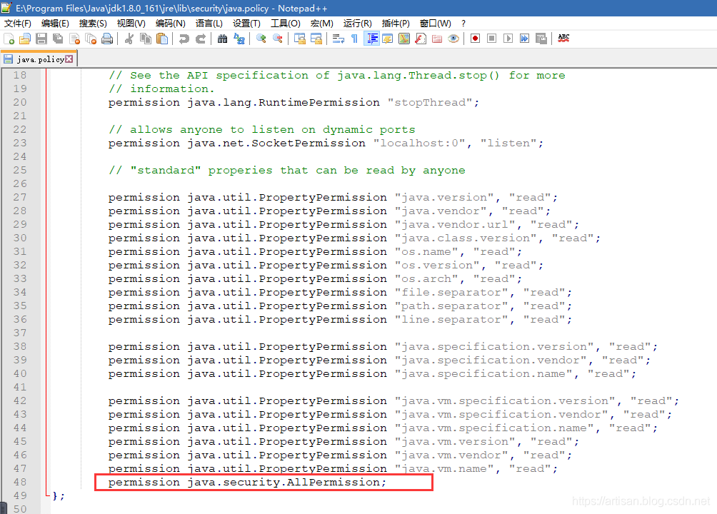 比如我本地的 E:\Program Files\Java\jdk1.8.0_161\jre\lib\security ,找到 java.policy ,在 grant最后一行加入 permission java.security.AllPermission; ,然后重启ES ,即可解决