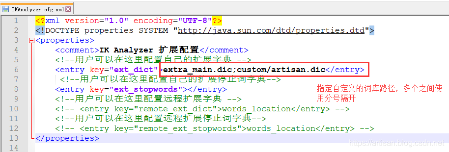 IKAnalyzer.cfg.xml:用来配置自定义词库