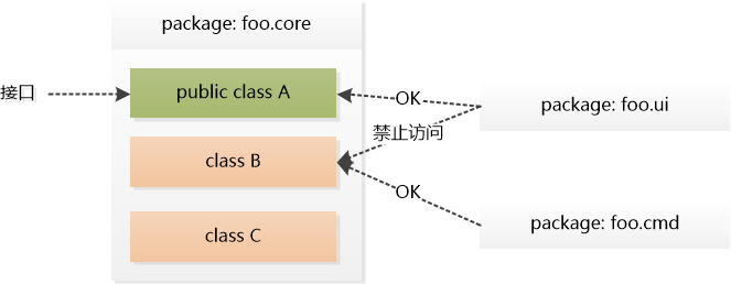 大臣甲小心地问道:“如果我只想把foo.core中的class B暴露给foo.cmd访问,同时阻止别的包访问class B,该怎么办呢? ”