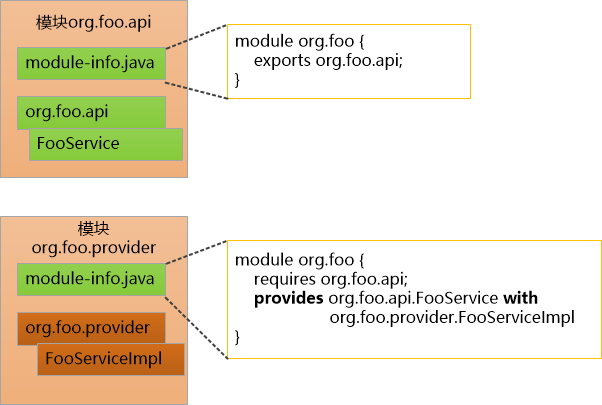 我可以把原来的模块分成两个模块,org.foo.api表示接口, org.foo.provider表示实现。