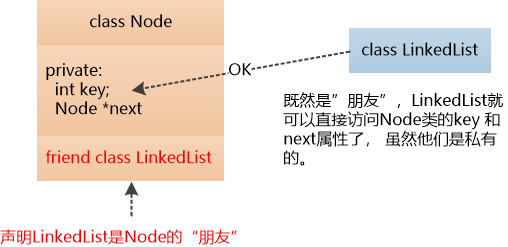 熟悉C++的大臣乙赶紧上奏:“陛下,C++ 有个什么friend class的概念。 例如在class Node 中声明了 friend class LinkedList , 那LinkedList 就可以访问Node 类的属性和方法了。 ”