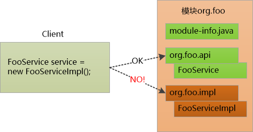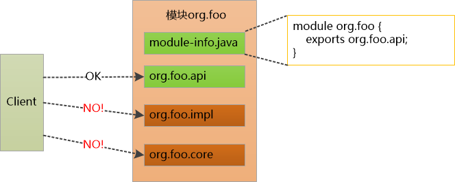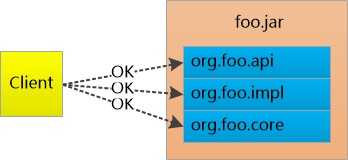 本来是想让org.foo.api对外提供接口,让Client去调用的,但实际上,只要foo.jar放到classpath中,另外两个package , org.foo.impl, org.foo.core中的类也就暴漏了。