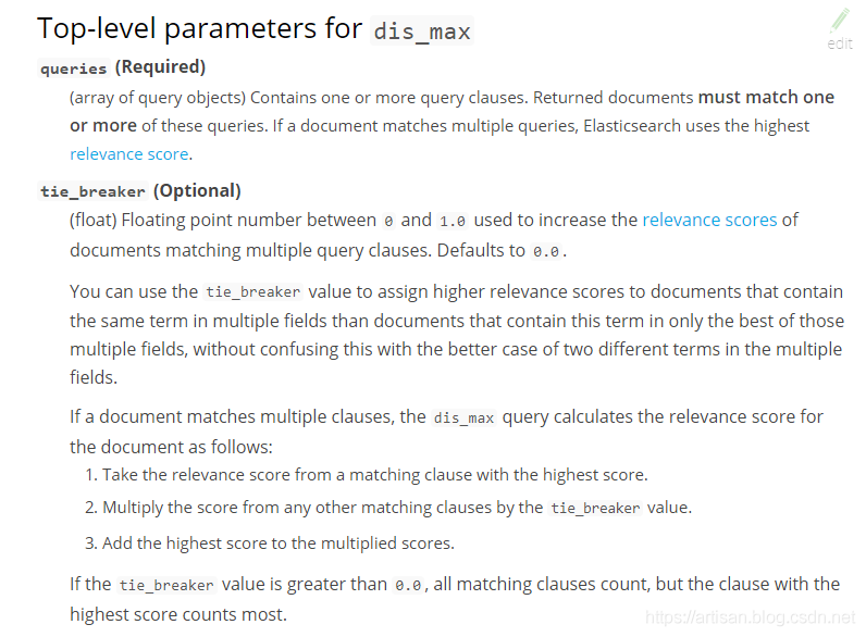 tie_breaker参数的意义,在于说,将其他query的分数,乘以tie_breaker,然后综合与最高分数的那个query的分数,综合在一起进行计算,除了取最高分以外,还会考虑其他的query的分数。