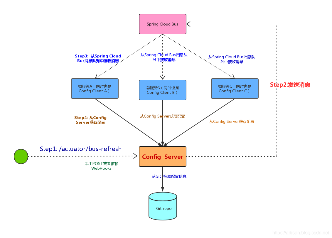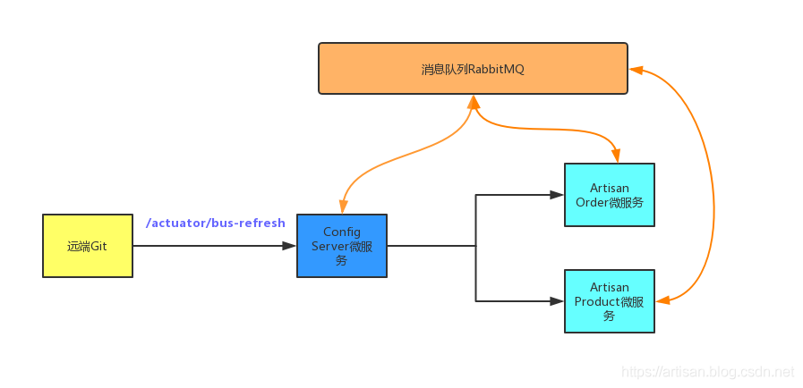 上图的架构将Config Server也纳入到了消息总线中,并使用Config Server的/actuator/bus-refresh端点来实现配置的刷新。 这样做的好处就是,各个微服务仅仅需要关注自身的业务,而不需要承担刷新配置的职责了。