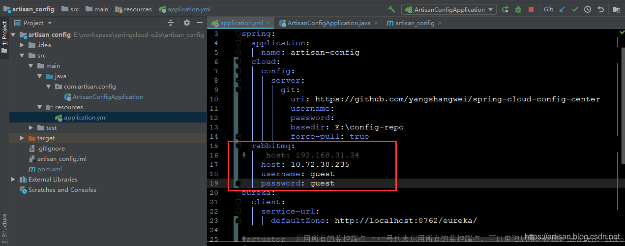 artisan-config (Config Server) 的 application.yml增加 RabbitMQ的配置信息如下