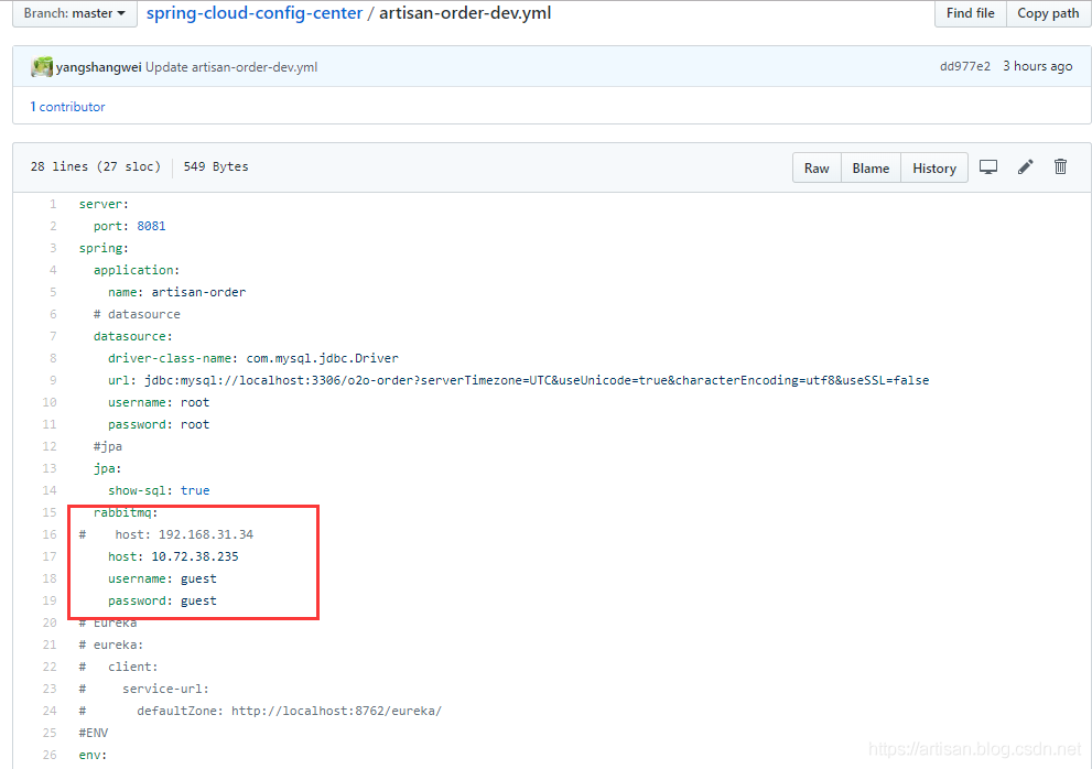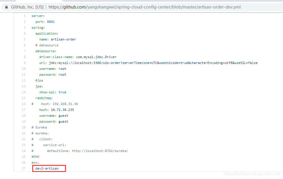 artisan-order(Config Client) 的配置文件增加 RabbitMQ的配置信息如下