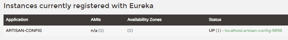 2019-04-09 21:40:56.069 INFO 23220 --- [nio-9898-exec-9] o.s.c.n.e.s.EurekaServiceRegistry : Registering application artisan-config with eureka with status UP