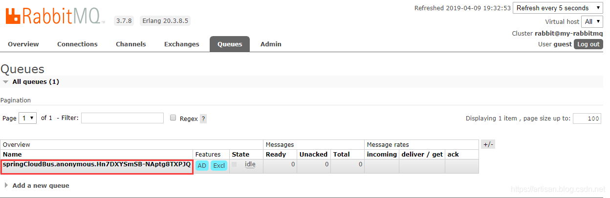 2019-04-09 19:46:54.902 INFO 22752 --- [nio-9898-exec-5] o.s.amqp.rabbit.core.RabbitAdmin : Auto-declaring a non-durable, auto-delete, or exclusive Queue (springCloudBus.anonymous.Hn7DXYSmSB-NAptg8TXPJQ) durable:false, auto-delete:true, exclusive:true. It will be redeclared if the broker stops and is restarted while the connection factory is alive, but all messages will be lost.