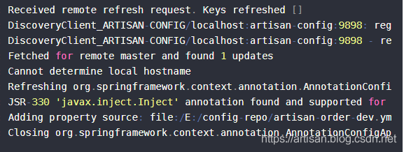2019-04-09 21:40:54.498 INFO 15384 --- [M-hMsHP_7Ig1A-1] c.c.c.ConfigServicePropertySourceLocator : Located environment: name=artisan-order, profiles=[dev], label=null, version=a5d2b388f4f5f0f77b0754f69458777740461be5, state=null