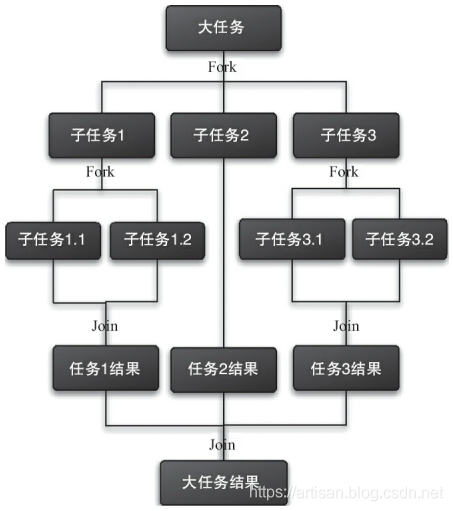 Fork就是把一个大任务切分为若干子任务并行的执行,Join就是合并这些子任务的执行结果,最后得到这个大任务的结果。