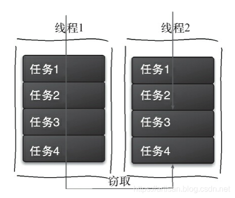 干完活的线程与其等着,不如去帮其他线程干活,于是它就去其他线程的队列里窃取一个任务来执行。而在这时它们会访问同一个队列,所以为了减少窃取任务线程和被窃取任务线程之间的竞争,通常会使用双端队列,被窃取任务线程永远从双端队列的头部拿任务执行,而窃取任务的线程永远从双端队列的尾部拿任务执行。