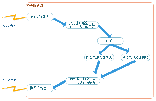 解析URL字符串和动作以确定用户代理请求的资源,根据匹配规则(通常根据正则表达式+后缀)路由到静态资源处理模块或动态资源处理模块。