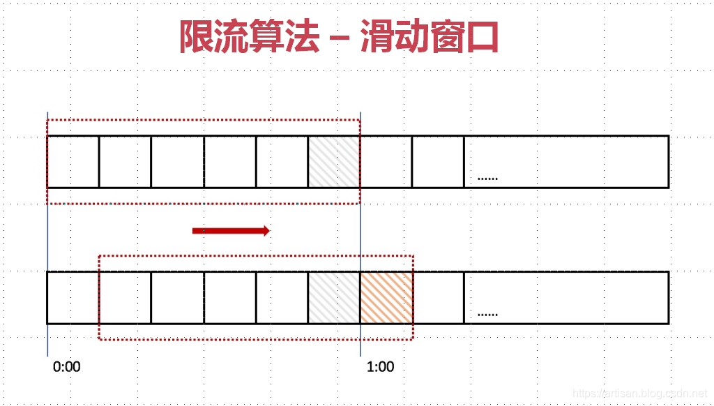 那么滑动窗口怎么解决刚才的临界问题的呢?我们可以看上图,0:59到达的100个请求会落在灰色的格子中,而1:00到达的请求会落在橘黄色的格子中。当时间到达1:00时,我们的窗口会往右移动一格,那么此时时间窗口内的总请求数量一共是200个,超过了限定的100个,所以此时能够检测出来触发了限流。
