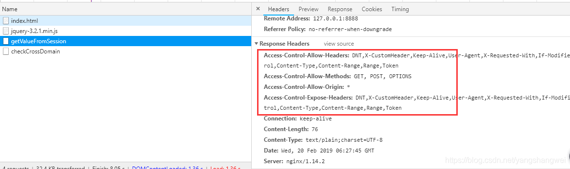 通过Nginx去解决跨域问题本质上是间接跨域,因为使用反向代理欺骗浏览器,所以浏览器任务客户端和服务端在相同的域名中,可以认为是同源访问,所以session不会丢失。上面的实验结论也证明了这一点