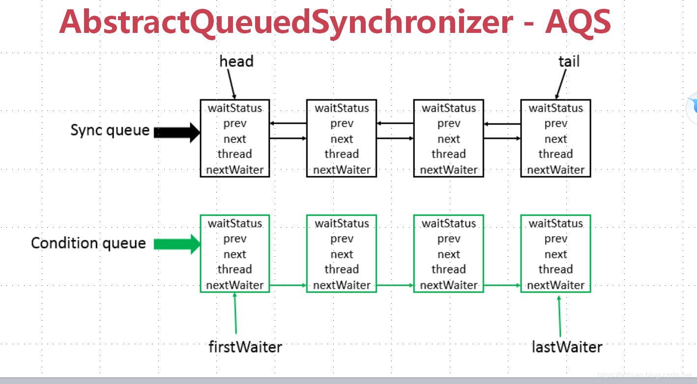- Condition queue:单向链表,不是必须的,只有程序中使用到Condition的时候才会存在,可能会有多个Condition queue