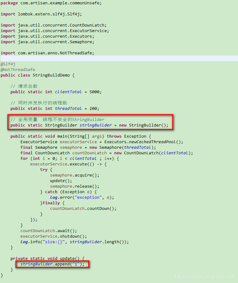 结果不等于5000,在多线程情况下,StringBuild是线程不安全的.