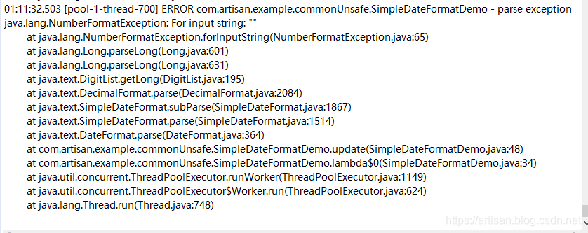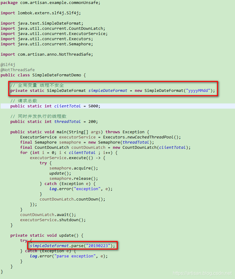 SimpleDateFormat 的实例对象在多线程共享使用的时候会抛出转换异常,正确的使用方法应该是采用堆栈封闭,将其作为方法内的局部变量而不是全局变量,在每次调用方法的时候才去创建一个SimpleDateFormat实例对象,这样利用堆栈封闭就不会出现并发问题。