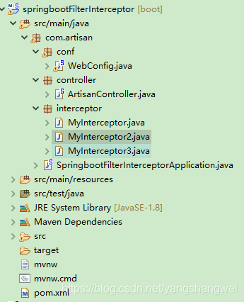 再新建两个拦截器MyInterceptor2和MyInterceptor3,为了验证下执行顺序,不搞的太复杂,代码和MyInterceptor一样,仅仅方法中的输出为了区分改成了对应的类名,如下所示