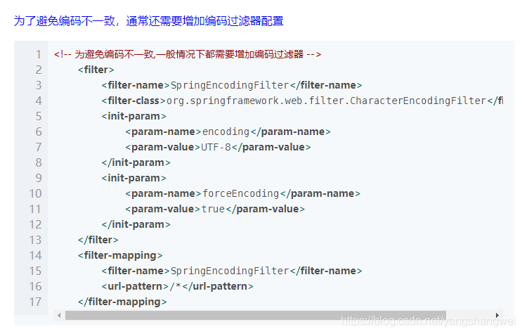 比如这篇很久前写的这个基于Spring的SSM整合文章SSM-Spring+SpringMVC+MyBatis整合案例从0到1 中为了避免编码不一致增加了编码过滤器配置
