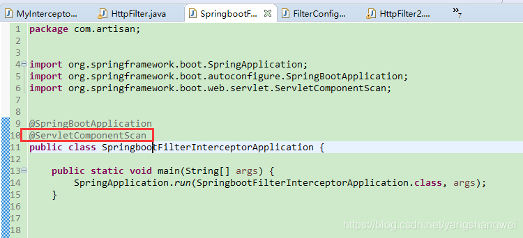 在 SpringBootApplication 上使用@ServletComponentScan 注解后,Servlet、Filter、Listener 可以直接通过 @WebServlet、@WebFilter、@WebListener 注解自动注册