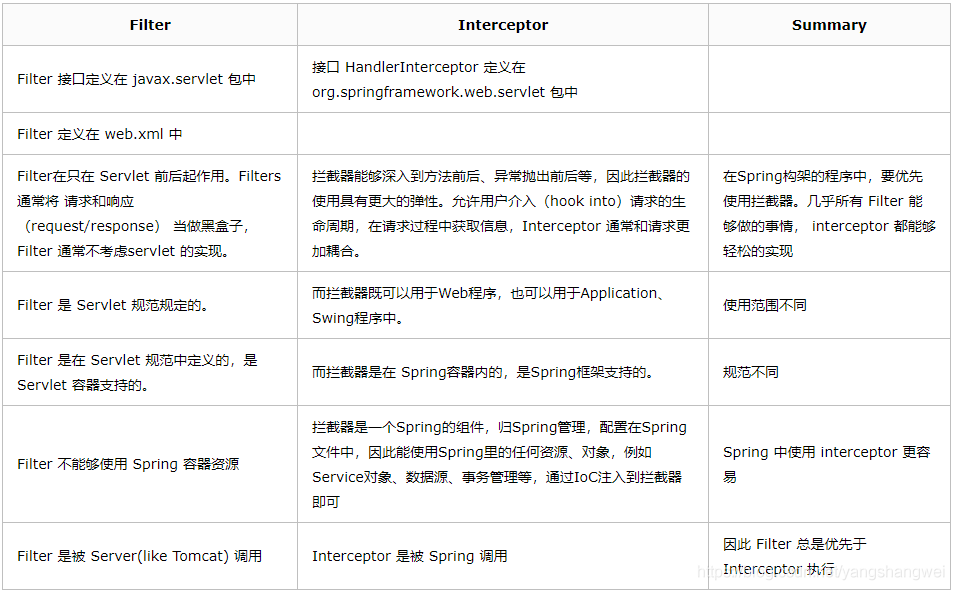 Filter的执行顺序在Interceptor之前 。 拦截器(Interceptor)是基于Java的反射机制,而过滤器(Filter)是基于函数回调。从灵活性上说拦截器功能更强大些,Filter能做的事情,Interceptor都能做,而且可以在请求前,请求后执行,比较灵活。
