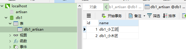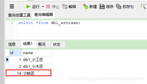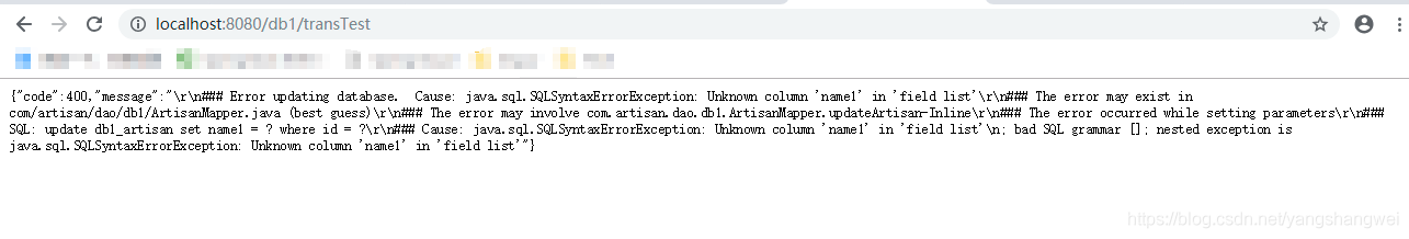 为了方便验证 artisanMapper.updateArtisan(artisan)中故意写错了个字段名,让其抛出异常,测试回滚。 执行方法后,可以看到因为第二个方法报错,第一个方法中的插入的数据也回滚了 。