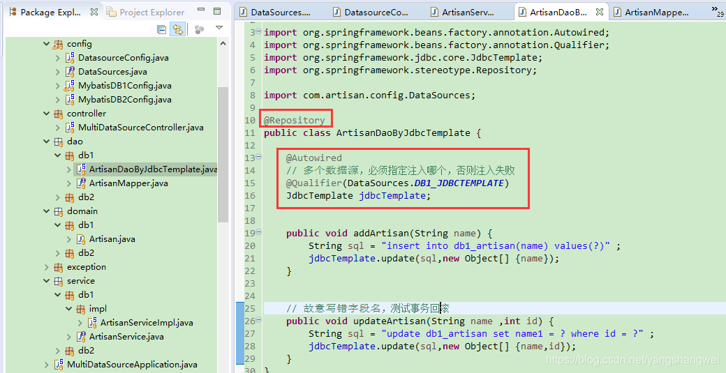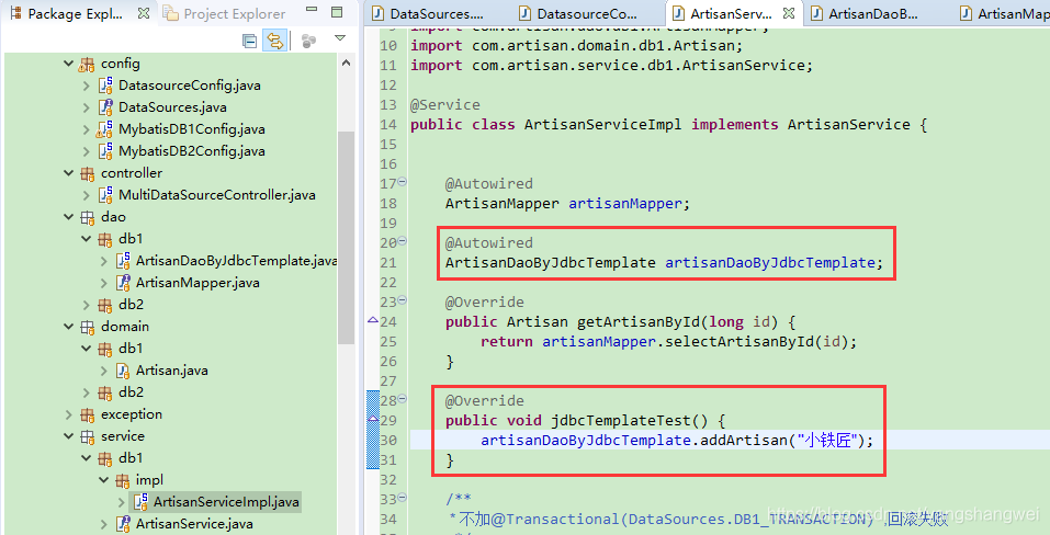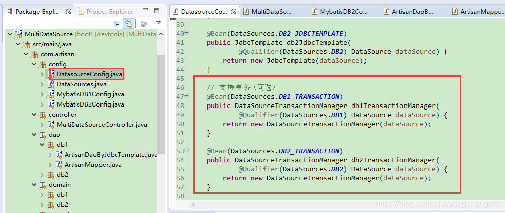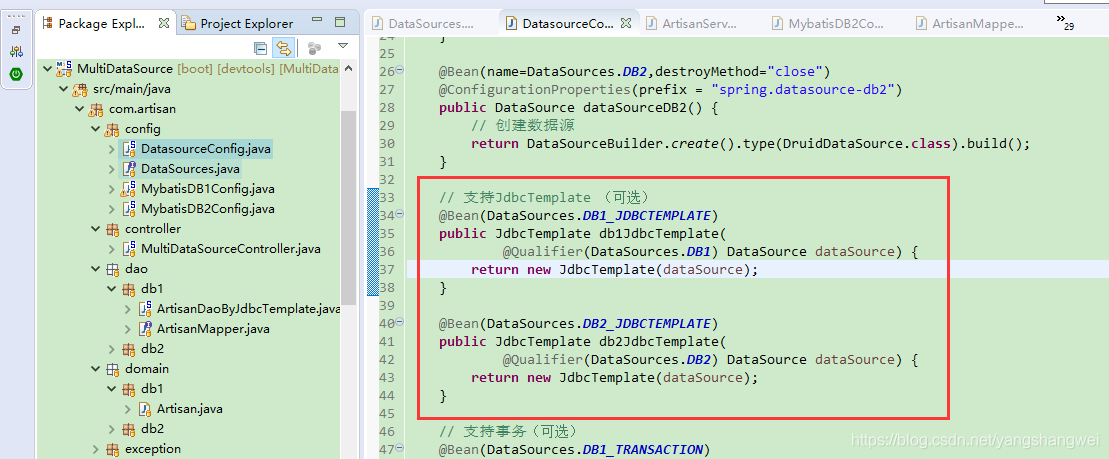 这里同时也初始化了JdbcTemplate和事务管理,当然了对这个例子是可选操作。 主要是不同DataSource的初始化