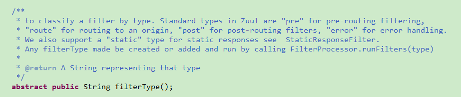- filterType: 过滤器的类型,取值如下 pre route post error . 可以从源码的注释中看到