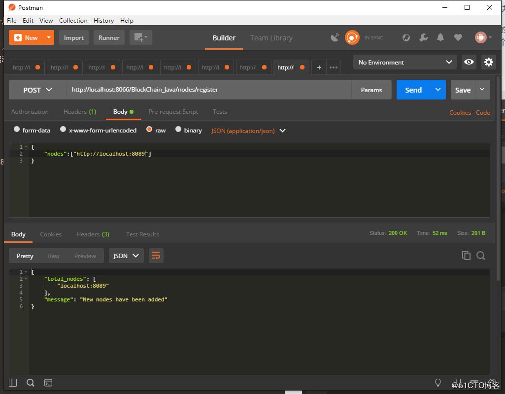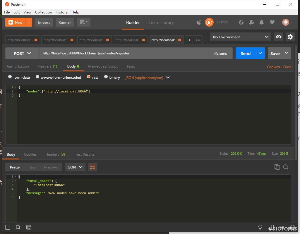 我们可以在不同的机器运行节点,或在一台机机开启不同的网络端口来模拟多节点的网络,这里在同一台机器开启不同的端口演示,配置两个不同端口的服务器即可,我这里启动了两个节点:http://localhost:8089 和 http://localhost:8066。