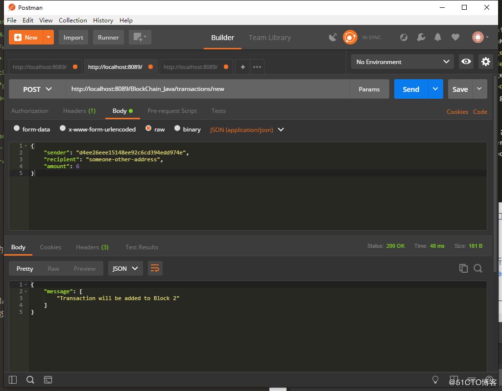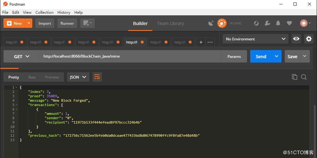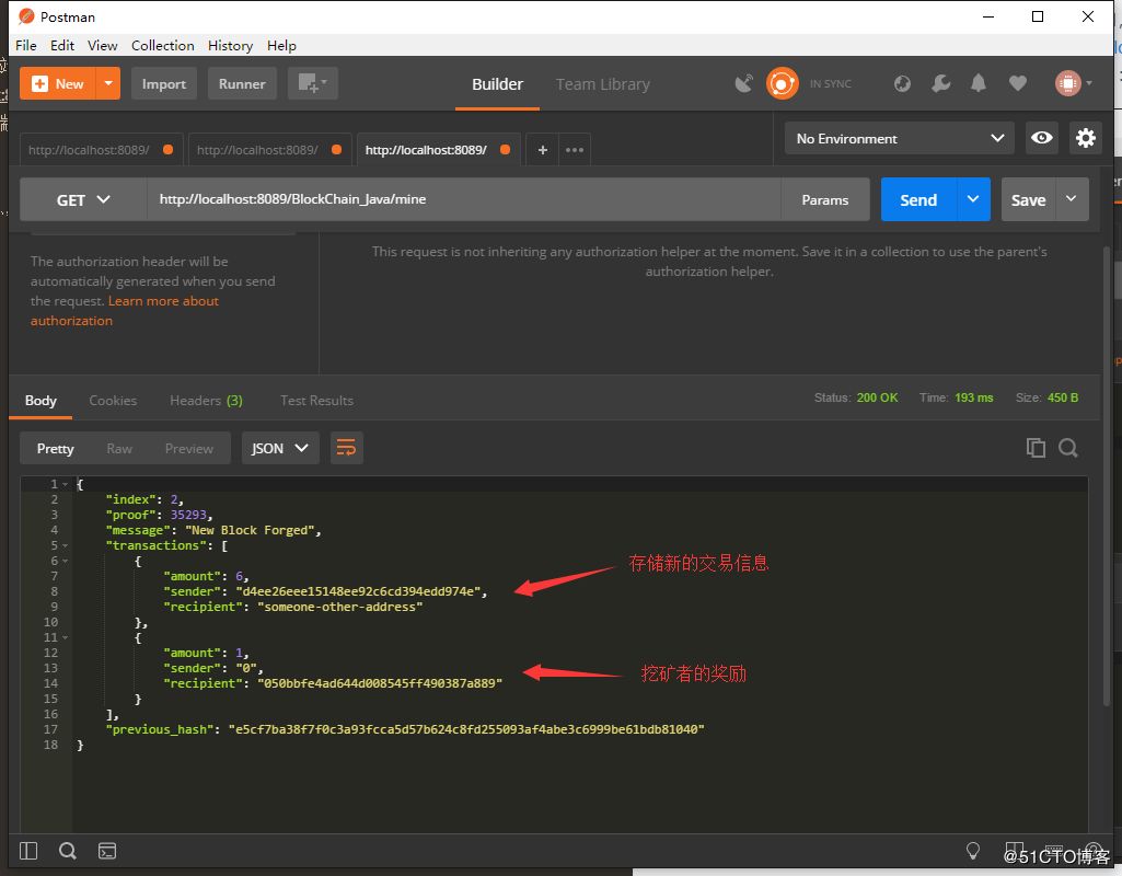 但是这时候还没有新的区块可以写入这个交易信息,所以我们还需要请求 http://localhost:8089/BlockChain_Java/mine 来进行挖矿,挖出一个新的区块来存储这笔交易: