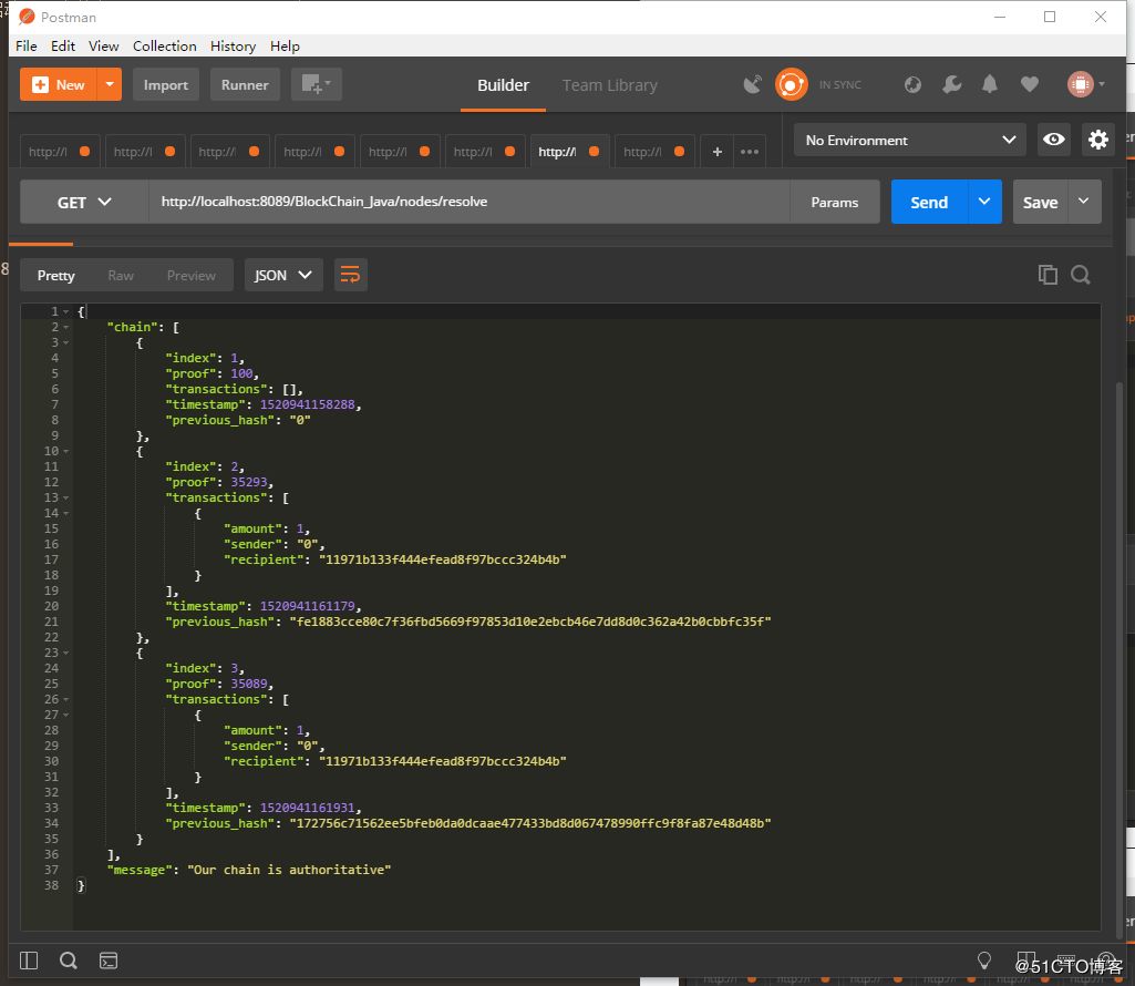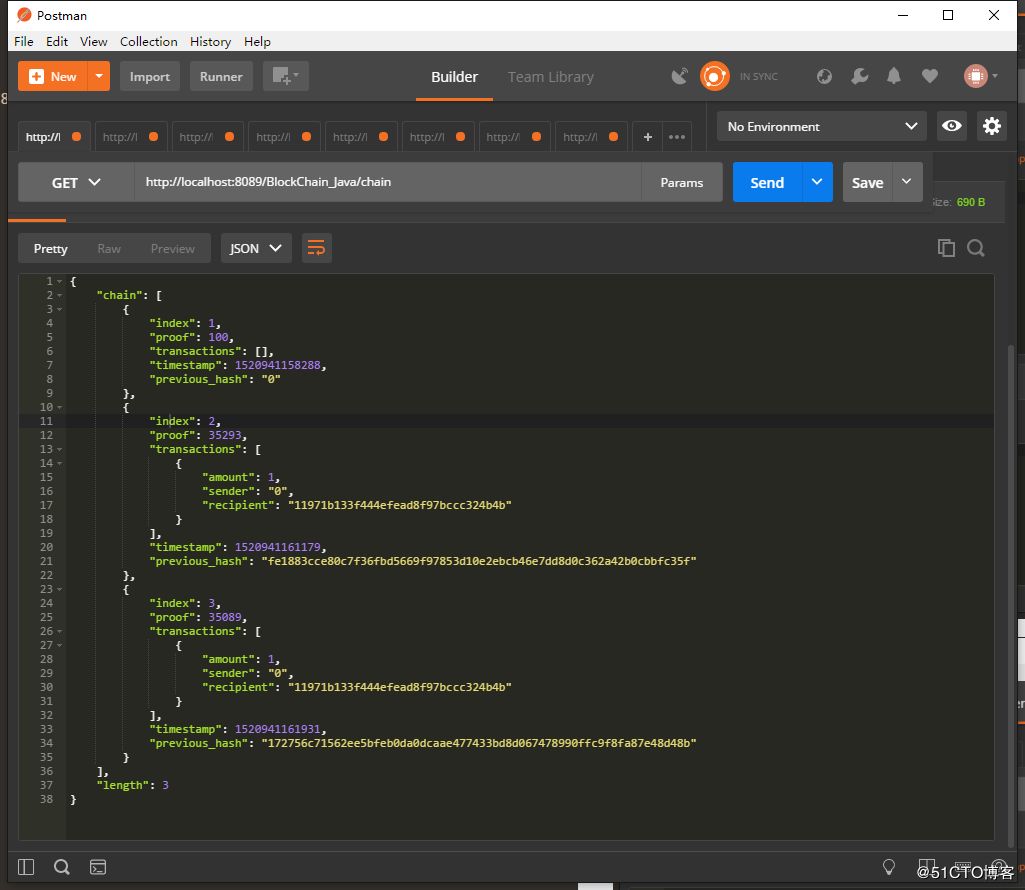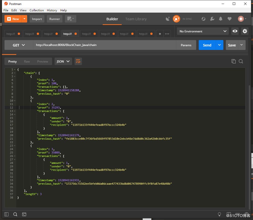 在挖了两次矿之后,就有3个块了,通过请求 http://localhost:8089/BlockChain_Java/chain 可以得到所有的区块块的信息:
