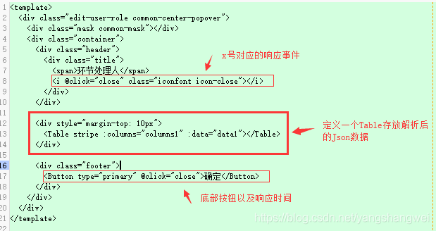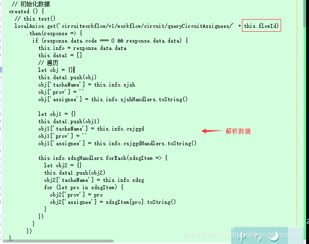 需求:需要在先有的页面上增加一个“查看处理人”的按钮,点击查看处理人,弹出子组件,将参数传递给子组件,初始化的时候created方法中发送请求到后台,接收到后台返回的JSON数据后,解析JSON展示到页面上。