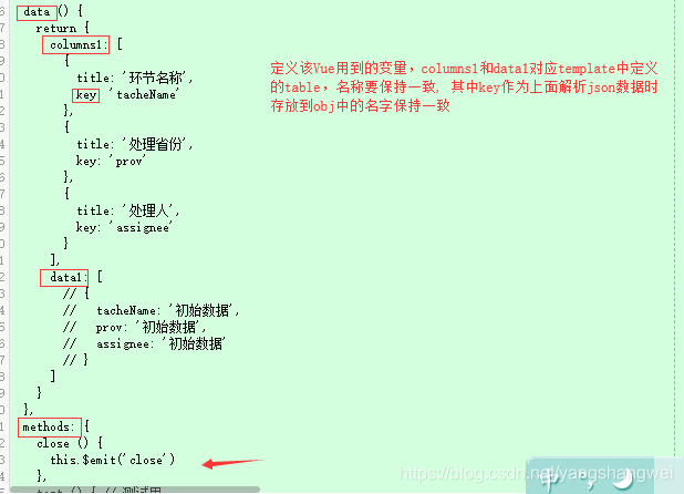 methods中对应自定义的方法,close方法使用$emit将关闭事件抛给父Vue.