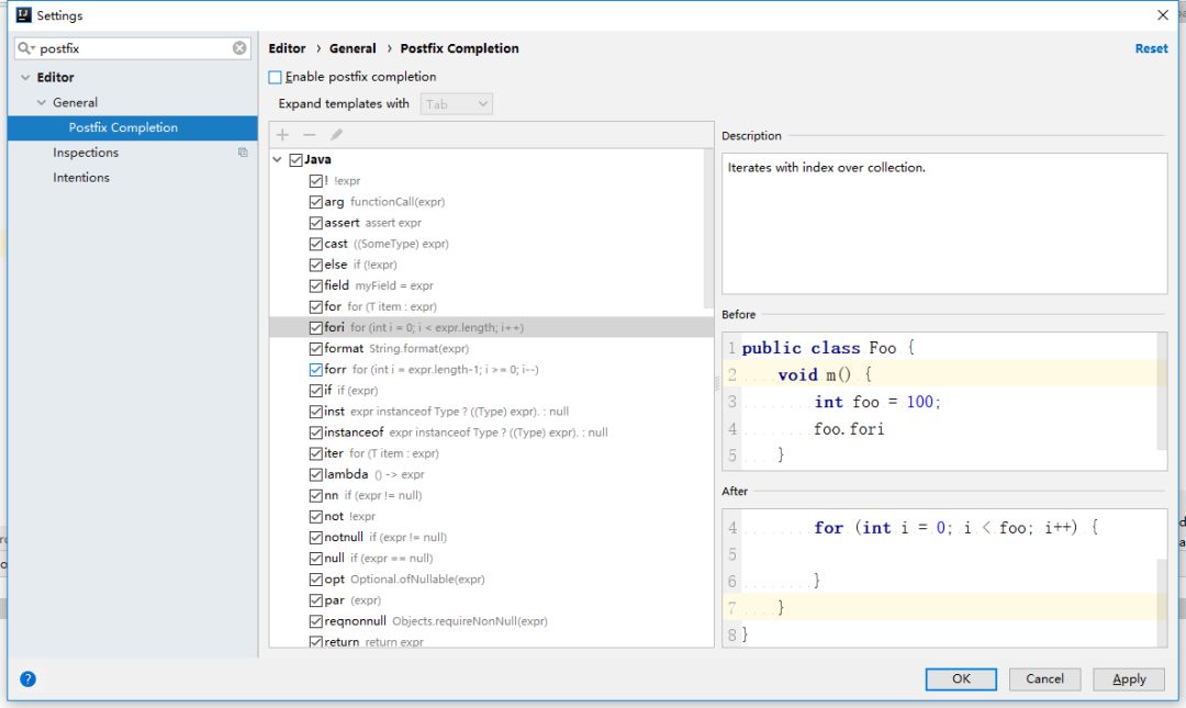 大家在写代码的时候,写完代码会用点来提示我们,例如,100. 敲完回车会生成一个for循环,用到的就是postfix,这是一种比 live Templates还快的小助手,当然它也是不可编辑的,里面定义了大量常见的函数和模板,熟练使用能提高我们很多的编码效率;