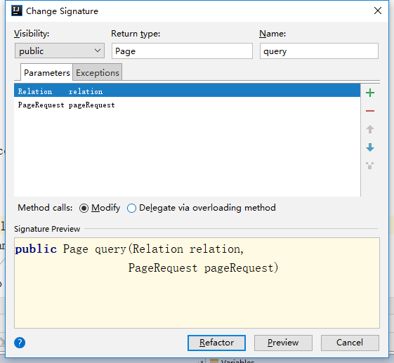 当你需要重构方法时,无论是增加参数,修改返回值,还是更改函数实现,只需要Ctrl+F6,就可以把所有用到此函数的地方一起重构,界面如下