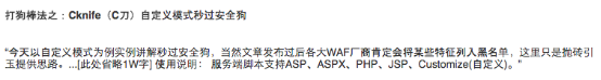 在原始的Cknife 论文贴中,Chora声明了Cknife功能和使用示例,并特别说明了webshell是为了绕过网页应用防火墙(WAF)而设计的,可以用于Red Team训练。
