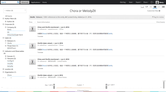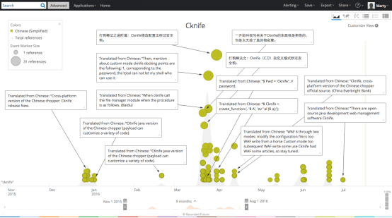 记录未来为Cknife记录的时间线显示其第一次出现是在2015年12月。2016年3月下旬因为Cknife发布了官方开源版本,出现次数明显激增。