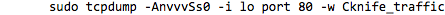 运行PHP服务器之后,启用 TCPDump 来捕获随后在环回接口上生成的数据包,然后将其保存到一个文件里进行审查。