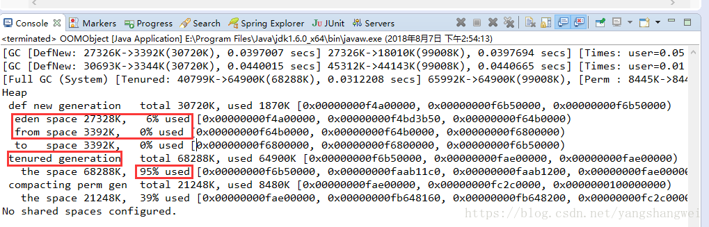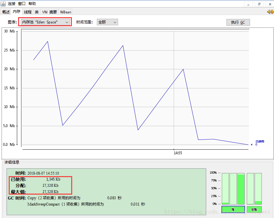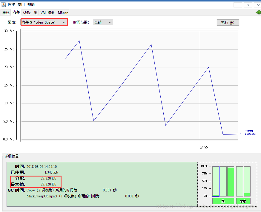 Eden内存区的大小为 (33M * 9/10 ) 新生代可用的空间 * 8/9 (Eden占用新生代的比例) = 27033.6KB 。 和 图中显示的27328 KB 接近。