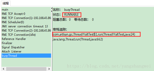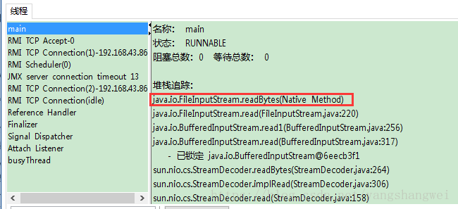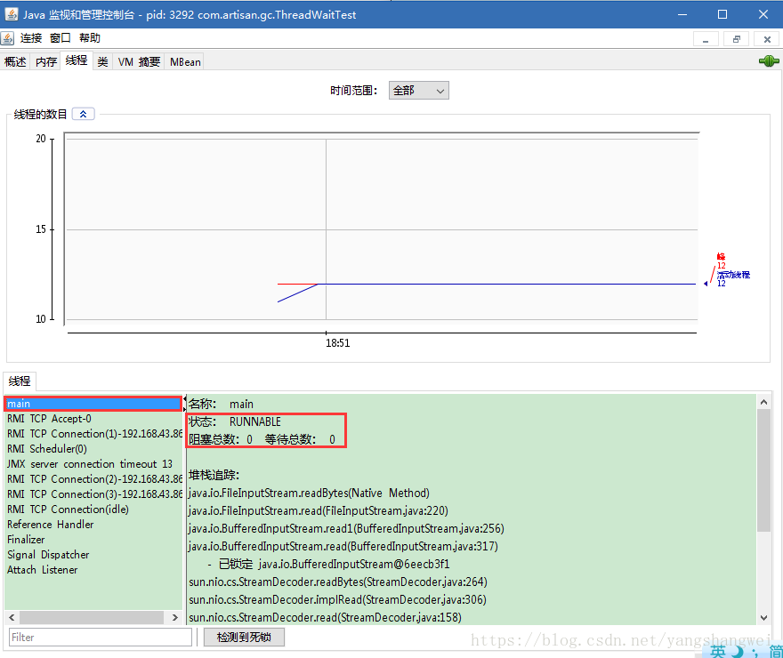 运行程序,启动 jconsole, 选择该进程 ,选择 “线程”页签,